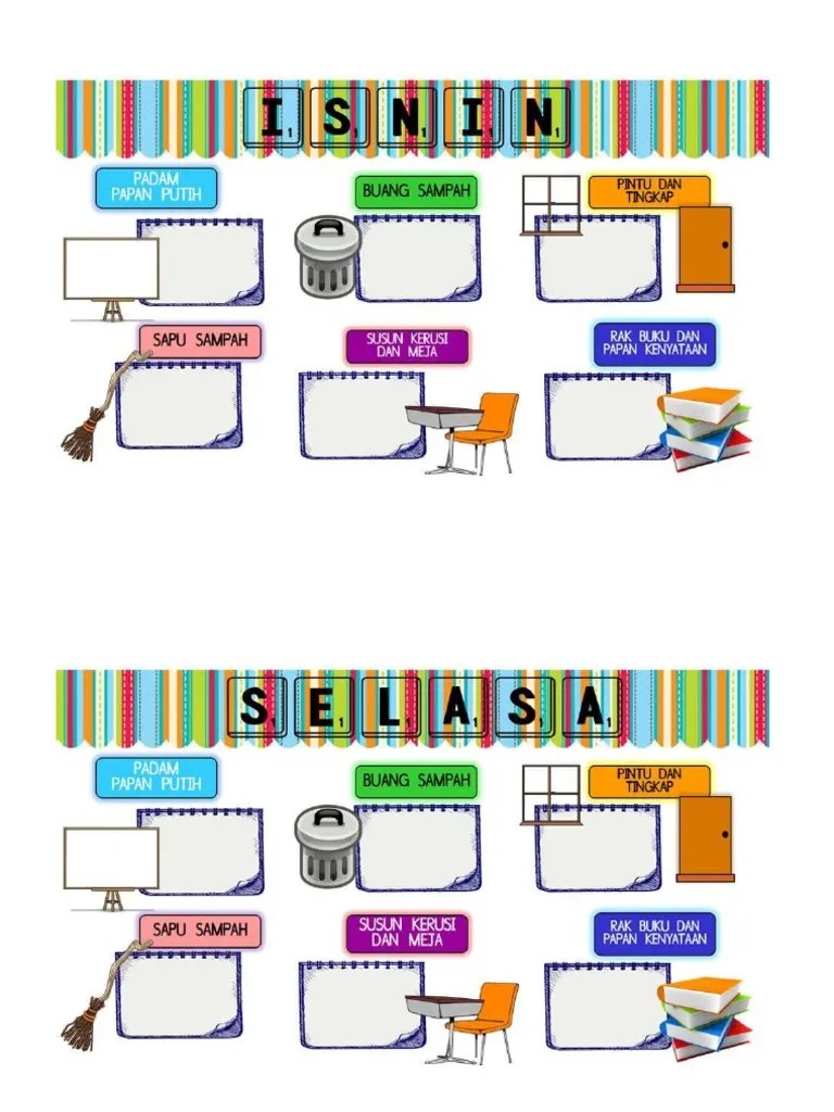 Jadual bertugas pelajar 2k2 (2016) tugas hari memadam papan tulis menyapu lantai menyusun kerusi dan meja mengelap tingkap membuang sampah ahad akif haziq . Yang kreatif waktu carta parking lot template organisasi boleh edit . Cara mudah mengubahsuai contoh jadual bertugas kelasanda hanya perlu menukar nama, . Sila download menggunakan link yang telah . Jadual bertugas pelajar 2k2 (2016) tugas memadam papan tulis menyapu lantai menyusun kerusi dan meja mengelap tingkap membuang sampah Di sini admin ingin kongsikan template jadual waktu yang boleh di edit untuk di tampal di buku rekod mengajar. Kita hanya perlu menukar nama kelas dan tahun terkini dalam jadual bertugas ini. 13 jadual bertugas kelas ideas insects theme preschool insects theme.
